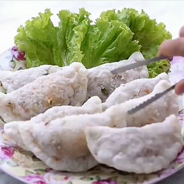 Bethari Taya Tantri Setyorini 1. - 100 gr tepung terigu - 250 gr tepung tapioka - Daun bawang potong-potong - Bawang putih halus - Garam dan kaldu jamur secukupnya - Lada secukupnya - 250-300 ml air panas. 2 batang daun seledri diiris halus.